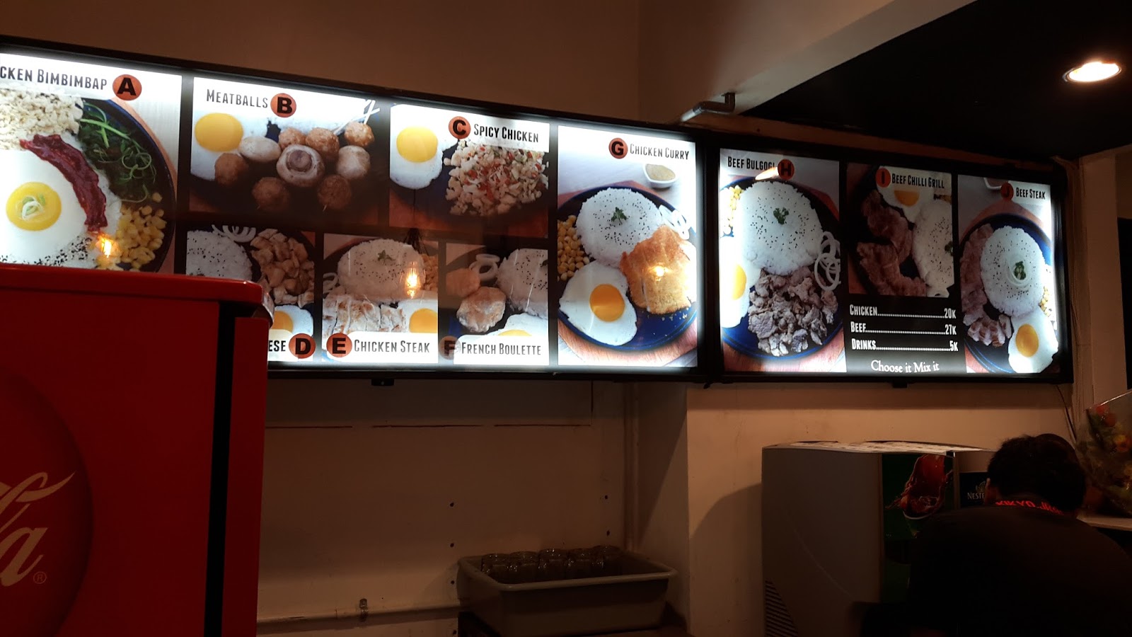 untuk menu Beef Rp 27.000,- Serta harga minuman Rp 5.000,- Untuk pemesanan, pembeli langsung pesan di booth kasir dan langsung membayar makanan dan minuman. Makanan dan minuman yang di pesan akan di antar ke tempat duduk pengunjung.